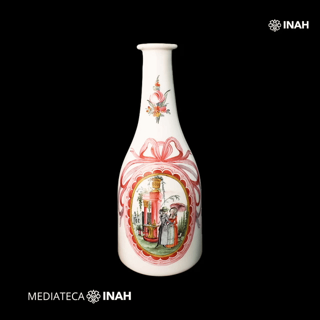 Esta elegante botella de porcelana destaca por su decoración, la cual evoca el gusto europeo del siglo XIX. Actualmente forma parte del acervo del Museo Nacional del Virreinato.