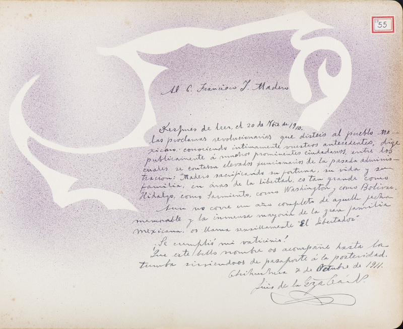 - "Al C. Francisco I. Madero. Después de leer el 20 de Nbre de 1910, las proclamas revolucionarias que disteis al pueblo mexicano, conociendo íntimamente vuestros antecedentes, dije públicamente a muchos prominentes ciudadanos, entre los cuales se estaban elevados funcionarios de la pasada administración: "Madero sacrificando su fortuna, su vida y su familia, en aras de la libertad, es tan grande como Hidalgo, como Sarmiento, como Washington y como Bolivar. Aún no corre un año completo de aquella fecha memorable y la inmensa mayoría de la gran familia mexicana, os llama sencillamente "El Libertador". ¡Se cumplió mi vaticinio!. Que este bello nombre os acompañe hasta la que este bello nombre os acompañe hasta la tumba sirviendo de pasaporte á la posteridad. Chihuahua 7 de Octubre de 1911". Aparece como firmante Luis de la E.