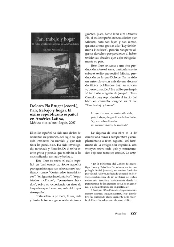 - Dolores Pla Brugat (coord.), Pan, trabajo y hogar. El exilio republicano español en América Latina, México, INAH/INM-Segob, 2007.