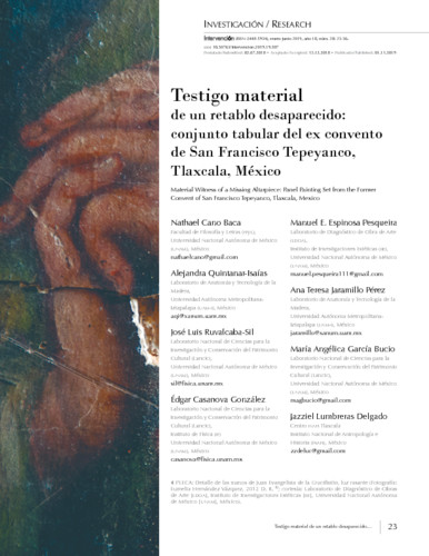 - This research presents the recovery of three fragments of panel painting in the state of Tlaxcala, Mexico. At the end of the twentieth century, these fragments were subject to a theoretical study, applying an interdisciplinary and inter-institutional methodology of historiographic and technical analysis in order to understand their meaning, technique, and alteration. The documentary testimony provided by the formal historical analysis, and the interpretation of the results on the technology and deterioration of the ruined complex helped relate these to a pictorial corpus that was likely inserted in the main altarpiece of the Franciscan conventual temple of Tepeyanco in the Noble and Loyal Republic of Indians of Tlaxcala in the 16th century.
