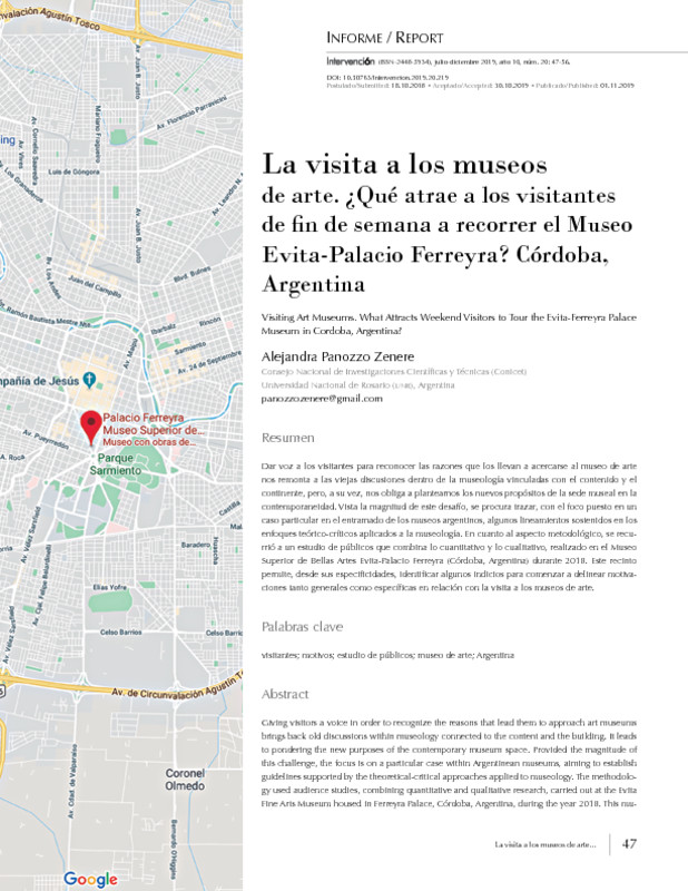 - Dar voz a los visitantes para reconocer las razones que los llevan a acercarse al museo de arte nos remonta a las viejas discusiones dentro de la museología vinculadas con el contenido y el continente, pero, a su vez, nos obliga a plantearnos los nuevos propósitos de la sede museal en la contemporaneidad. Vista la magnitud de este desafío, se procura trazar, con el foco puesto en un caso particular en el entramado de los museos argentinos, algunos lineamientos sostenidos en los enfoques teórico-críticos aplicados a la museología. En cuanto al aspecto metodológico, se recurrió a un estudio de públicos que combina lo cuantitativo y lo cualitativo, realizado en el Museo Superior de Bellas Artes Evita-Palacio Ferreyra (Córdoba, Argentina) durante 2018. Este recinto permite, desde sus especificidades, identificar algunos indicios para comenzar a delinear motivaciones tanto generales como específicas en relación con la visita a los museos de arte.
