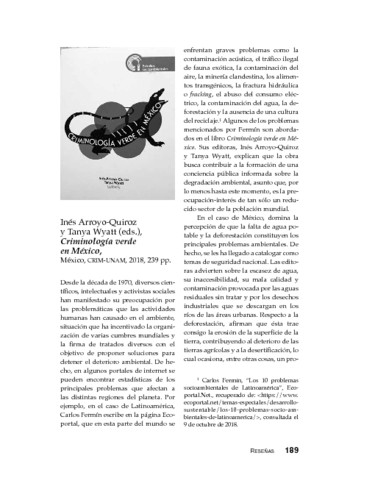 - Inés Arroyo-Quiroz y Tanya Wyatt (eds.), Criminología verde en México, México, CRIM-UNAM, 2018, 239 pp.