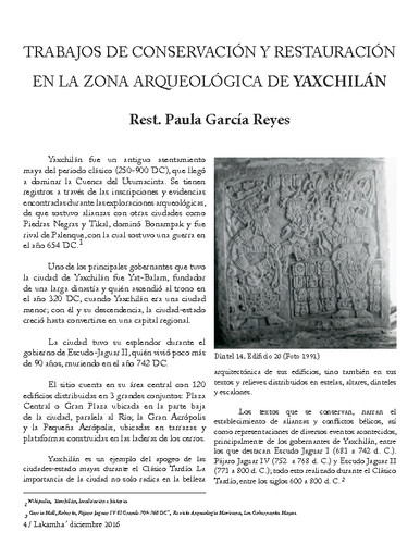 - URL Trabajos de conservación y restauración en la Zona arqueológica de Yaxchilán. Lakamha'. Boletín informativo del Museo de Sitio y la Zona Arqueológica de Palenque. Núm. 53 (2016)