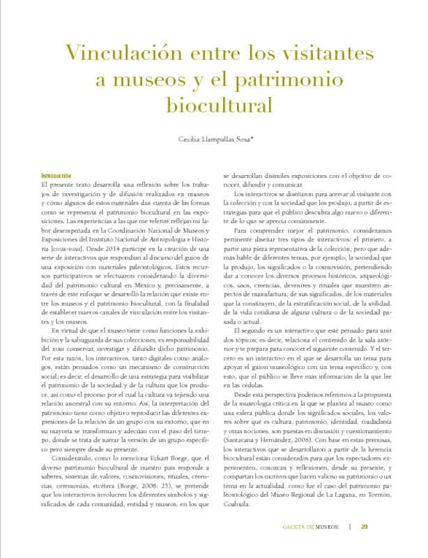 - URL Vinculación entre los visitantes a museos y el patrimonio biocultural. Gaceta de Museos. Museos y patrimonio biocultural Núm. 77 (2020)
