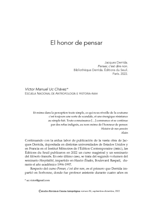 - URL El honor de pensar. Cuicuilco Vol. 29 Núm. 85 (2022) Antropología y culturas mediáticas