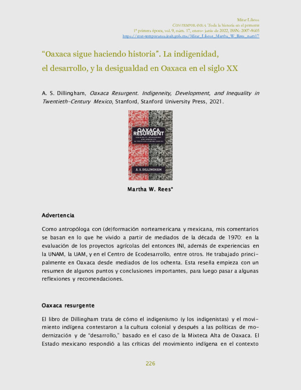 - URL “‘Oaxaca sigue haciendo historia’ La indigenidad, el desarrollo, y la desigualdad en Oaxaca en el siglo XX”. Con-temporánea Núm. 17 (2022)