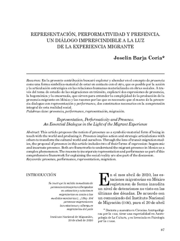 - ANZALDÚA, Gloria (1999), Borderlands/La Frontera. The New Mestiza, San Fran- cisco, Aunt Lute Books. BARJA, Joselin (2014), "Migraciones clandestinas: una etnografía del tránsito indocumentado por México", tesis de maestría, UAM-Iztapalapa, México, 178 pp. _____(2019), "'En este mar de absurdas persecuciones'. Presencias migrantes centroamericanas en contextos de violencia", tesis de doctorado, UAM-Iztapa- lapa, México, 389 pp. BARRÓN, Yulma, Rafael FERNÁNDEZ y Leandro RIVERA (2014), Migración centroamericana en tránsito por México hacia Estados Unidos. Diagnóstico y recomendaciones. Hacia una visión integral regional y de responsabilidad compartida, México, Instituto Tecnológico Autónomo de México. BUTLER, Judith (2009), "Performatividad, precariedad y políticas sexuales", AIBRK. Revista de Antropología Iberoamericana, vol. 4, núm. 3, septiembre-diciembre, pp. 321-336. CASILLAS, Rodolfo y Rodolfo CÓRDOVA (2018), "Un vuelco de timón. Prioridades y estrategias para la migración en tránsito", Documentos de Política Migratoria, 04, México, CIDE. DE GENOVA, Nicholas (2013), "Spectacle of Migrant 'Illegality': The Scene of Exclusion, the Obscene of Inclusion", Ethnic and Racial Studies, vol. 36, núm.7, pp. -1198. DE LAURETIS, Teresa (1984), Alicia ya no. Feminismo, semiótica, cine, Madrid, Cátedra/Universitat de Valéncia/Insti- tuto de la Mujer. DÍAZ, Rodrigo (2008), "La celebración de la contingencia y la forma. Sobre la antropología de la performance", Nueva Antropología, vol. XXI, núm. 69, julio-diciembre, pp. 33-59. _____(2017), "Iconoclasia, performance y la opacidad de la presencia", Alteridades, vol. 27, núm. 54, julio-diciembre, pp. 13-26. DOUGLAS, Mary (1973), Pureza y peligro. Un análisis de los conceptos de pureza y tabú, Madrid, Siglo XXI. DURAND, Jorge y Douglas S. MASSEY (2003), "El núcleo básico de la migración México-Estados Unidos. Premisas para entender y explicar el proceso", en Jorge DURAND y Douglas S. MASSEY, Clandestinos. Migración México-Estados Unidos en los albores del siglo XXI, México, Miguel Ángel Porrúa Librero Editor/Universidad Autónoma de Zacatecas, pp. 45-61. DURAND, Jorge, Douglas S. MASSEY y Karen PREY (2009), "Nuevos escenarios de la migración México-Estados Unidos. Las consecuencias de la guerra antiinmigran- te", Papeles de Población, vol. 15, núm. 61, pp. 101-128. DÜVELL, Frank (2012), "Transit Migration. A Blurred and Politicised Concept", Population, Space and Place, vol. 18, núm. 4, pp. 415-427. EVANS, Brad y Henry GIROUX (2015), Disposable Futures: The Seduction of Violence in the Age of Spectacle, Canadá, Open Media Series. GHOSH, Ranjan y Ethan KLEINBERG (2013) [1967], Presence: Philosophy, History and Cultural Theory for the Twenty-First Century, Ithaca, Nueva York, Cornell University Press. GONZÁLEZ, Adriana (2015), "Migrantes centroamericanos en tránsito por México. Trayectorias, redes y riesgos", tesis de doctorado, Universidad Complutense de Madrid, 321 pp. GUMBRECHT, Hans Ulrich (2004), Production of Presence. What Meaning Cannot Con- vey, California, Standford University Press. HALL, Stuart (2010), Sin garantías: trayectorias y problemáticas en estudios culturales, Instituto de Estudios Socia- les y Culturales Pensar/Pontificia Universidad Javeriana/Instituto de Estudios Peruanos/Universidad Andina Simón Bolívar sede Ecuador/Envión Editores. HOOKS, bell (2004), "Mujeres negras. Dar forma a la teoría feminista", en bell HOOKS, Avtar BRAH, Chela SANDOVAL, Gloria ANZALDÚA et al., Otras inapropiables. Feminismos desde las fronteras, Madrid, Traficantes de Sueños, pp. 33-50. INSTITUTO NACIONAL DE MIGRACIÓN (2020), "Actúa INM con responsabilidad ante la contingencia por Covid-19", Boletín No. 125/2020 (comunicado de prensa), 20 de abril, recuperado de: https://www.gob.mx/inm/prensa/actua-inm-con-responsa-bilidad-ante-la-contingencia-por-covid-19-241034#:-:text=Ante%20la%20emer-gencia%20sanitaria%20actual,a%20ple- nitud%20sus%20derechos%20humanos., consultada el 10 de agosto 2020. JOHNSON, Anne (2014), "¿Qué hay en un nombre? Una apología del performance", Alteridades, núm. 48, julio-diciembre, pp. 9-21 MARTÍNEZ, Graciela, Salvador COBO y Juan Carlos NARVÁEZ (2015), "Trazando rutas de la migración del tránsito irregular o no documentada por México", Perfiles Latinoamericanos, vol. 23, núm. 45, pp.127-155. MOSCOVICI, Serge (1973), "Foreword", en C. HERZLICH (ed.), Health And Illness: A Social Analysis, Londres, Academic Press, pp. 13-26. _____(1979), Psicología de las minorías activas, Madrid, Ediciones Morata. NÁJERA, Jessica (2016), "El complejo estudio de la actual migración en tránsito por México: actores, temáticas y circunstancias", Migraciones Internacionales, vol., 8, núm. 3, enero-junio. OACNUDH (2016), "Situación de los migrantes en tránsito", en página de la Oficina del Alto Comisionado de Naciones Unidas para los Derechos Humanos, recuperado de: https://www.ohchr.org/Documents/Issues/Migration/StudyMigrants/OHCHR_2016_Report-migrants-transit_SP.pdf, consultada el 15 de agosto de 2020. OCORÓ, Anny (2010), "Los negros y negras en la Argentina. Entre la barbarie, la exotización, la invisibilización y el racismo de Estado", La Manzana de la Discordia, vol. 5, núm. 2, julio-diciembre, pp. 45-63. OSORIO, Ever (2014), "La Bestia: muerte y violencia hacia migrantes en tránsito por México", tesis de maestría, UIA, México, 80 pp. PFLEGER, Sabine (2015), Frontera, mujeres y hombres oscuros. La construcción narrativo-mediática del feminicidio en Ciudad Juárez, Vigo, Academia del Hispanismo. PRIETO, Diego y Citlalli QUECHA (2015), "Presentación", Boletín. Colegio de Etnólogos y Antropólogos Sociales: "La antropología y la etnografía en los universos de la contemporaneidad", México, CEAS. QUIROZ, Yolanda (2014), "Transmigración de centroamericanos por México: su vulnerabilidad y sus derechos humanos", tesis de doctorado, El Colegio de la F