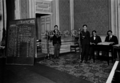 Funcionarios y adolescentes gritones celebran un sorteo de Lotería Nacional