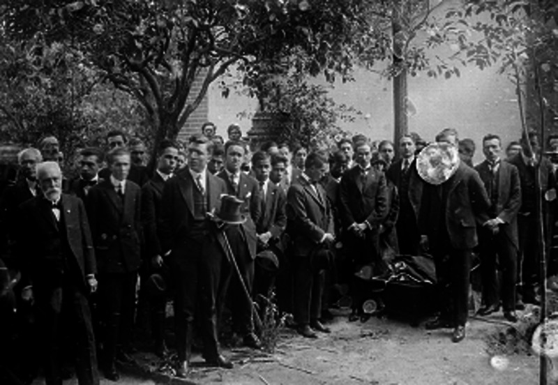 Hombres de apariencia elegante reunidos en un panteón, durante un sepelio