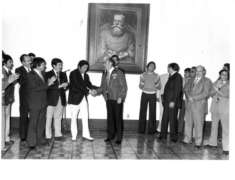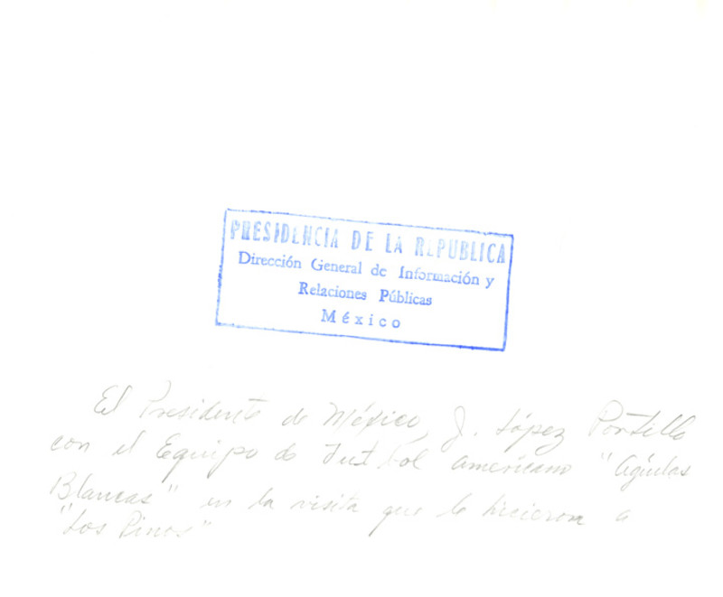 - I.O. Al reverso: "El Presidente de México J. López Portillo con el Equipo de Futbol americano "aguílas Blancas" en la visita que le hicieron a "Los Pinos". También se observa un sello "PRESIDENCIA DE LA REPUBLICA Dirección General de Información y Relaciones Públicas México". Equipo de Águilas Blancas. Son un equipo de fútbol americano representativo del Instituto Politécnico Nacional; regularmente son la base del selectivo para el "Clásico Poli-Universidad". Surge en 1969 en el campus de Santo Tomás, aunque sus bases se remontan hasta los orígenes del fútbol americano en el Instituto Politécnico Nacional en 1936. El primer entrenador del equipo fue Alfonso "La Chita" Cabrera, posteriormente se designa al Dr. Jacinto Licea como entrenador en jefe y actual líder, con el cual han logrado 5 campeonatos a nivel nacional: 1973, 1981, 1982, 1988 y 1992. Véase: www./es.wikipedia.org/wiki/Águilas_Blancas, (última consulta 3 de septiembre de 2009). Probablemente el evento se llevó acabo en 1981, ya que ese año el equipo de futbol obtuvo un campeonato y es costumbre que sean recibidos por el presidente. Al fondo de la imagen se observa la pintura de Venustiano Carranza, obra de David Alfaro Siqueiros la cual es factible que se localice en la sala Carranza de los Pinos.