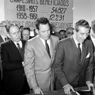 - Adolfo López Mateos, Teófilo Borunda y otras personas durante un acto agrario en Chihuahua.