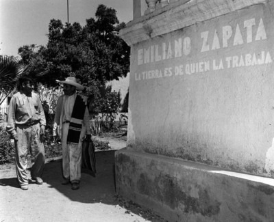 - Campesinos caminan junto a muro con leyenda de Zapata