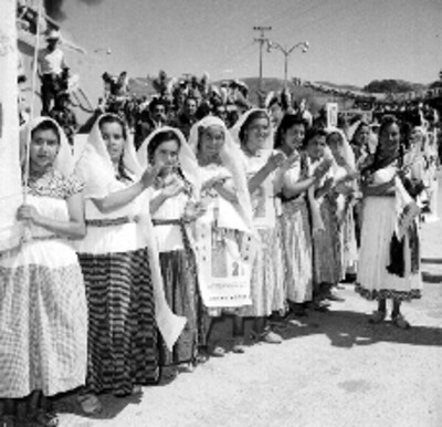 - Mujeres indígenas aplaudiendo durante un mitín a la campaña de Lopez Mateos en Hidalgo