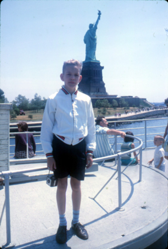 - Niñno de pie en cubierta de barco, al fondo la Estatua de la Libertad