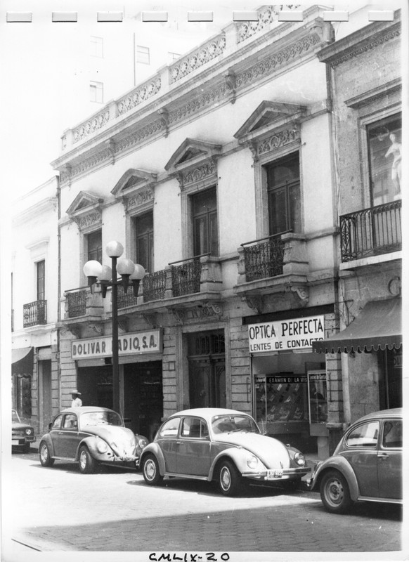 - Lentes de contacto, calle Bolívar, radio, fachadas, persona caminando, automóvil de la década 1970, comercios, óptica "Perfecta"