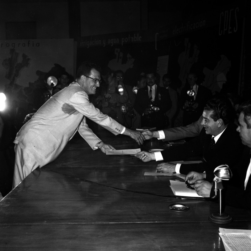 - Adolfo López Mateos entregando diploma a un político en una asamblea económico-social durante su campaña en Guadalajara.