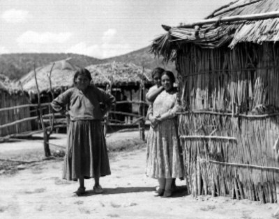 - Mujeres Yaqui junto a chozas de paja en una aldea, retrato de grupo
