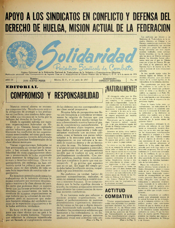 - Solidaridad. Periódico Sindical de Combate.Órgano de la Federación Nacional de Trabajadores de la Industria y Comunicaciones Eléctricas Núm. 46 Primera época (1957) junio