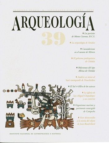 - - Presentación por Ana María Álvarez y Ángel García Cook. - Los pericúes de Monte Cuevoso, Baja California Sur: su entorno, costumbres y salud por Liliana Torres Sanders y Armando de Jesús Romero Monteverde. - Entre la Sierra Madre y el mar: la arqueología de Sinaloa por John P. Carpenter Slavens y Guadalupe Sánchez Miranda. - El mundo mágico del curandero en el noreste de México por Diana Zaragoza Ocaña. - La Gran Cuadra de la ciudad: el gobierno prehispánico de Cholula por Michael Lind. - Los entretenedores en los policromos del tipo Albina de Cholula: una propuesta iconográfica por Araceli Rojas Martínez Gracida. - Ofrenda asociada a muro con serpientes en Tenochtitlan: análisis en torno al huei tzompantli por Alberto Diez Barroso Repizo. - El Sol 4-Ollin de los aztecas por Arnold Lebeuf. - La antigua iglesia de San Miguel Chapultepec y sus entierros por Jorge Cervantes Martínez. - Organismos marinos asociados al patrimonio cultural sumergido de Campeche, México: relación y efectos de la interacción biológica por Pedro Horacio López Garrido. - Siete reflexiones que desmienten la teoría del objeto de Jean Baudrillard por Jesús E. Sánchez. - Sustento académico de la propuesta para inscribir en letras de oro en el recinto legislativo del Distrito Federal el nombre de Cuitláhuac, señor de Iztapalapa, décimo tlatohani mexica-tenochca por Jesús E. Sánchez. - Miguel Sarmiento y la historia de las investigaciones arqueológicas en Cantona por Yadira Martínez Calleja. - Reseña. La producción alfarera en el México antiguo, III, IV y V por Mónica Zamora Rivera.