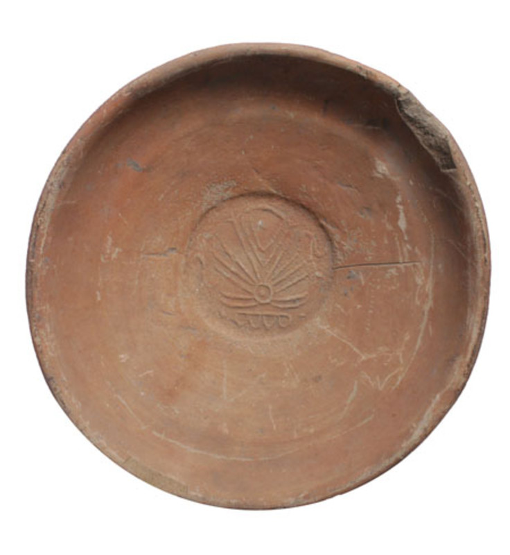- Recipiente utilizado cotidianamente para contener alimentos. Elaborados para beber pulque, el sello del monograma debió de referirse a la pulquería o a los nombres de sus dueños. Al fondo presenta sello vegetal con la imagen de un maguey.