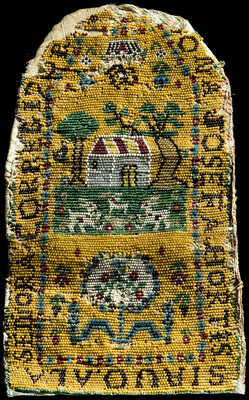 - Fragmento de bolsa elaborado en bordado de chaquira cosida a una tela forrada de raso color azul celeste. Sobre un fondo amarillo, el decorado muestra una casa en medio de dos árboles y un jardín con flores y animales y leyenda en el ruedo.
