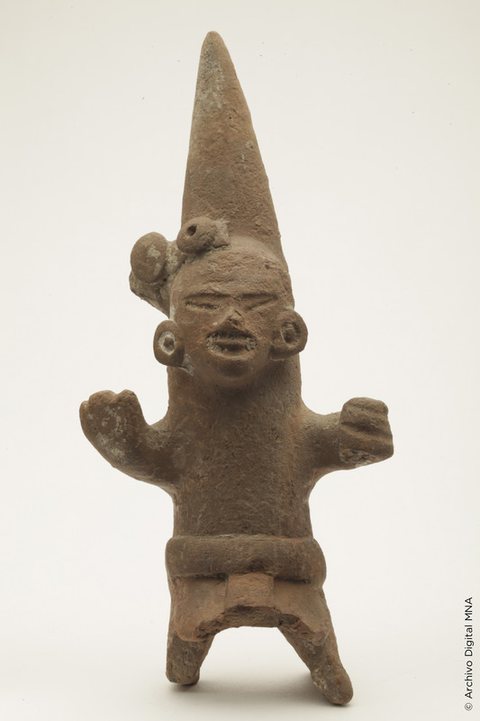 - FIGURILLA ANTROPOMORFA MASCULINA, HUECA, LA FORMA GENERAL ES CÓNICA, PIES TRAPEZOIDALES BURDOS, CUERPO CILÍNDRICO, BRAZOS CORTOS, (IZQUIERDO ABIERTO A UN COSTADO Y CON LA MANO CERRADA, DERECHO AL FRENTE CON LA PALMA ABIERTA), CABEZA SOBRESALIENTE ATAVIADA CON TOCADO DE BANDA CON CUENTAS DISCOIDALES, OREJERAS DISCOIDALES Y GRAN GORRO CÓNICO, TAMBIEN VISTE MAXTLATL.