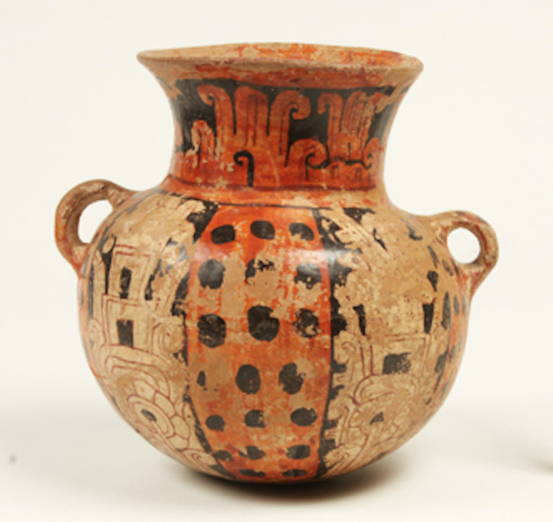 - Base convexa, cuerpo curvo convergente con dos asas, cintas verticales en el cuerpo, cuello curvo divergente, borde curvo divergente y boca circular. Con motivos decorativos simbólicos y geométricos.