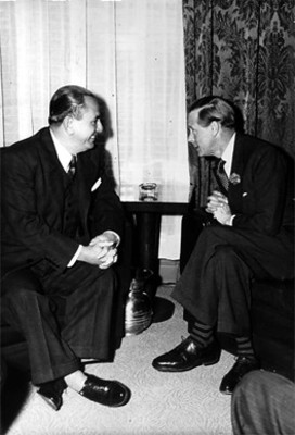 Jaime Torres Bodet conversa con Fernando Casas Aleman durante una ceremonia ...