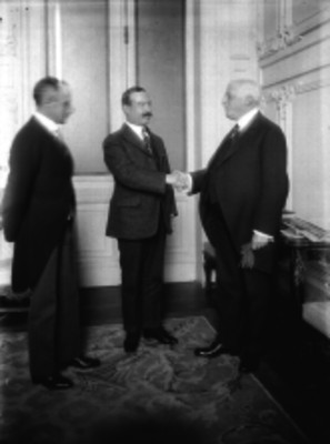 Hombres en actitud de despedida, entre ellos el Marquez de González de España e Hilario Medina ...