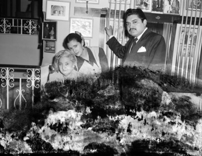 Mujeres y hombre en la sala de una casa, retrato de grupo ...