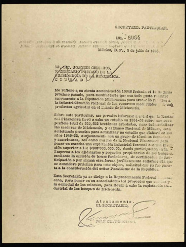 - Carta de Juan Gil Preciado, secretario, dirigida al lic. Joaquín Cisneros, secretario privado de la Presidencia de la República, en la cual confirma la reunión con la Diputación Michoacana para tratar la industrialización de los recursos maderables y los subproductos agrícolas en el Estado de Michoacán. Menciona además las intenciones del Banco Nacional de México de actualizar un estudio que elaboraron entre 1949-1952, para poner en marcha la explotación industrial forestal de los bosques de Michoacán.