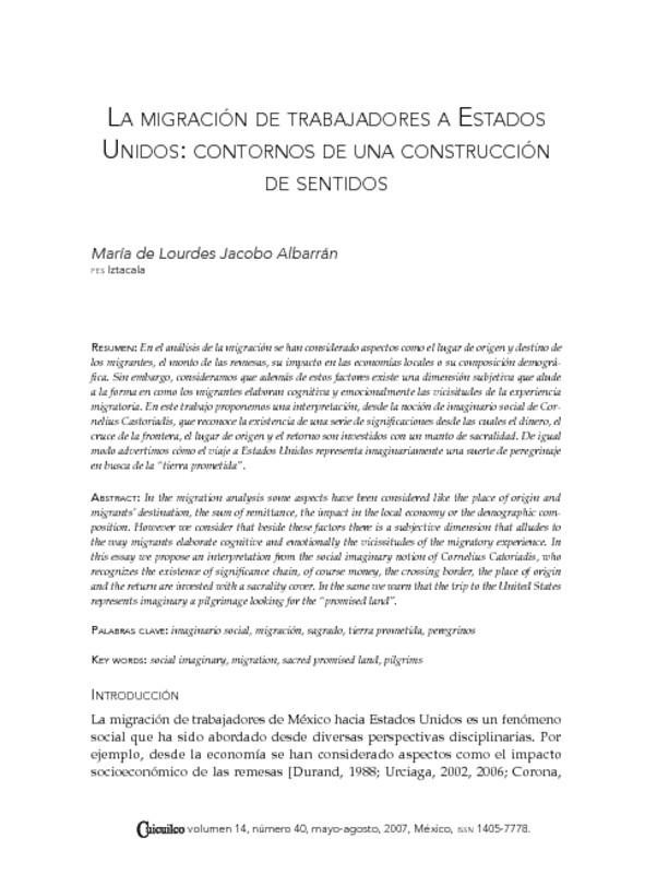 - In the migration analysis some aspects have been considered like the place of origin and migrants’ destination, the sum of remittance, the impact in the local economy or the demographic com-position. However we consider that beside these factors there is a subjective dimension that alludes to the way migrants elaborate cognitive and emotionally the vicissitudes of the migratory experience. In this essay we propose an interpretation from the social imaginary notion of Cornelius Catoriadis, who recognizes the existence of significance chain, of course money, the crossing border, the place of origin and the return are invested with a sacrality cover. In the same we warn that the trip to the United States represents imaginary a pilgrimage looking for the “promised land”.