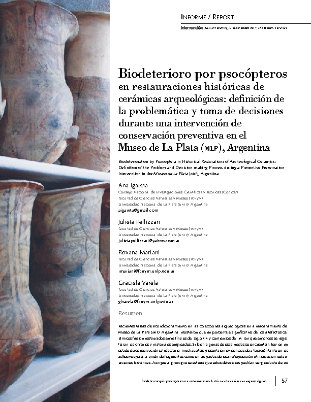 - Biodeterioro por psocópteros en restauraciones históricas de cerámicas arqueológicas: definición de la problemática y toma de decisiones durante una intervención de conservación preventiva en el Museo de La Plata (MLP), Argentina