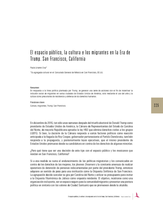 El espacio público, la cultura y los migrantes en la Era de Trump. San Francisco, California