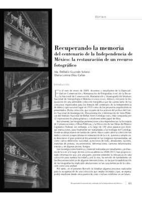 En enero del 2009, el taller de restauración de la Especialidad de Conservación y Restauración de Fotografías (ERCF) de la Escuela Nacional de Conservación, Restauración y Museografía del Instituto Nacional de Antropología e Historia (ENCRyM-INAH) dio inicio a la recuperación de una colección de 32 fotografías de principios del siglo XX que actualmente pertenecen al Centro Nacional de Investigación, Documentación e Información de Artes Plásticas (CENIDIAP-Instituto Nacional de Bellas Artes (INBA)). Se trata de imágenes producto de diversos procesos fotográficos y en variados soportes que muestran una serie de proyectos arquitectónicos y escultóricos, en dibujo y maqueta, elaborados para su construcción rumbo a las celebraciones del centenario de la Independencia de México, en 1910. A lo largo de 100 años, estas fotografías estuvieron bajo la custodia de diferentes instituciones y presentaban diversos grados de deterioro. Este Reporte detalla el proceso de restauración de 26 de las obras, mediante el cual se recuperaron características documentales y estéticas de la colección, y se implementaron tratamientos innovadores para la restauración de fotografías en México.