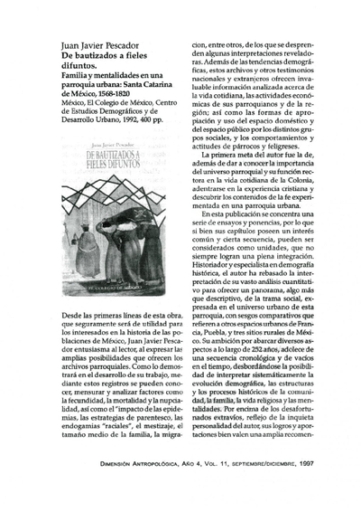 Juan Javier Pescador, De bautizados a fieles difuntos, Familia y mentalidades en una parroquia urbana: Santa Catarina de México, 1568-1820, México, El Colegio de México, Centro de Estudios Demográficos y de Desarrollo Urbano, 1992, 400 pp.