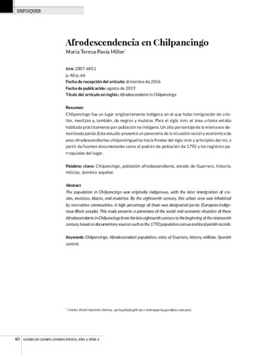 - Chilpancingo fue un lugar originariamente indígena, en el que hubo inmigración de criollos, mestizos y, también, de negros y mulatos. Para el siglo XVIII, el área urbana estaba habitada prácticamente por población no indígena. Un alto porcentaje de la misma era denominada parda. Este estudio presenta un panorama de la situación social y económica de esos afrodescendientes chilpancingueños hacia finales del siglo XVIII y principios del XIX, a partir de fuentes documentales como el padrón de población de 1792 y los registros parroquiales del lugar.