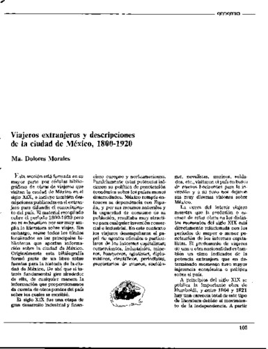 - Esta sección está formada en su mayor parte por células bibliográficas de obras de viajeros que visitan la ciudad de México en el siglo XIX, e incluye también descripciones publicadas en el extranjero para difundir el conocimiento del país. El material recopilado cubre el periodo 1800-1920 pero no es exhaustivo por ser muy amplia la literatura sobre viajes.