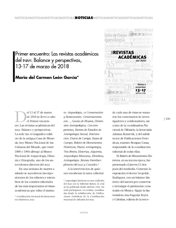- Primer encuentro: Las revistas académicas del INAH. Balance y perspectivas, 13-17 de marzo de 2018