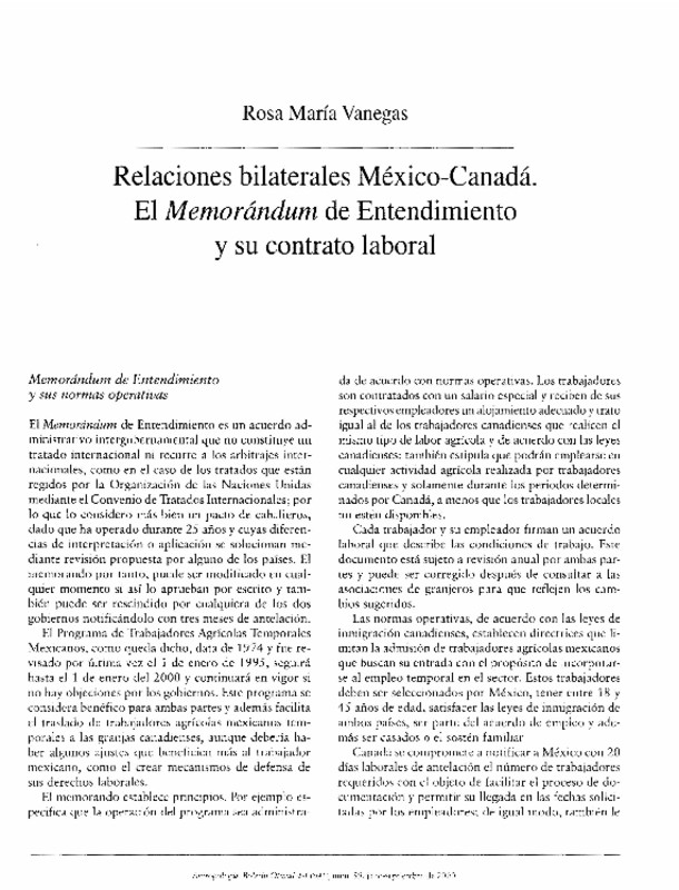 - URL Relaciones bilaterales México-Canadá. El Memorándum de Entendimiento y su contrato laboral. Antropología Núm. 59 (2000) Misceláneo