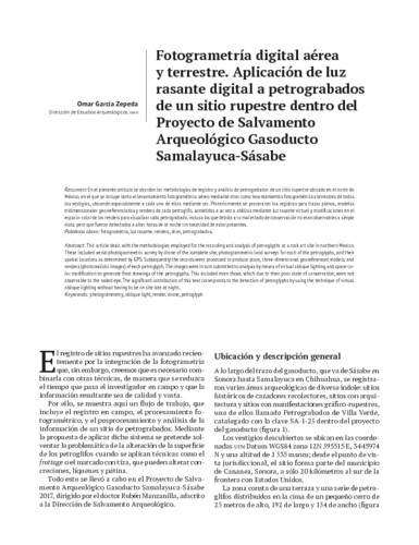 - Url Fotogrametría digital aérea y terrestre. Aplicación de luz rasante digital a petrograbados de un sitio rupestre dentro del Proyecto de Salvamento Arqueológico Gasoducto Samalayuca-Sásabe. Arqueología Núm. 61 (2020)