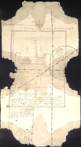 Es un rectángulo de papel amate en el que se dibujó un plano, le faltan varios fragmentos y tiene marcas de humedad. Arriba en la parte central aparece un edificio con almenas y una cruz (a la izquierda se puede leer “Al monesteryo”). A los costados de esta construcción salen dos líneas rojas que forman un rectángulo que abarca casi todo el documento. El edificio y el rectángulo corresponden a un monasterio y su patio. En medio del patio aparecen el dibujo de un juego de pelota, un círculo y tres caminos; el primer camino corre de izquierda a derecha, el segundo de abajo hacia arriba y el último es transversal. En la parte inferior del documento aparecen dos casas unidas por medio de una línea roja.