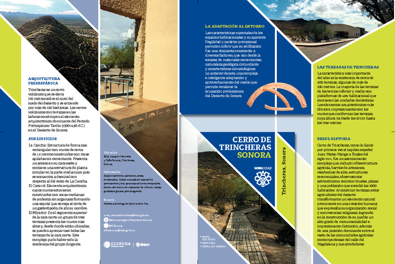 - Cerro de Trincheras, como lo llamó por primera vez el capitán español Juan Mateo Mange a finales del siglo XVII, fue un asentamiento complejo que incluyó infraestructura agrícola, barrios de artesanos, residencias de elite, estructuras ceremoniales, observatorios astronómicos, recintos rituales, plazas y una población que excedió los 1000 habitantes. Al construir terrazas, estos agricultores del desierto transformaron un elemento natural prominente en una creación humana que expresaba su organización social y sus creencias religiosas, logrando en la construcción de su pueblo un alto grado de monumentalidad e impresionante distinción, además de una posición dominante entre el resto de las comunidades agrícolas contemporáneas del valle del Magdalena y sus alrededores.
