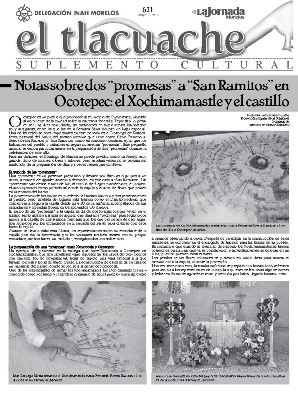 - Notas sobre dos “promesas” a “San Ramitos” en Ocotepec: el Xochimamastle y el castillo por María Fernanda Rivera Bautista. - Entrega de “velas” durante la Semana Santa en Coatetelco, Morelos por Janeth Pineda Paredes.