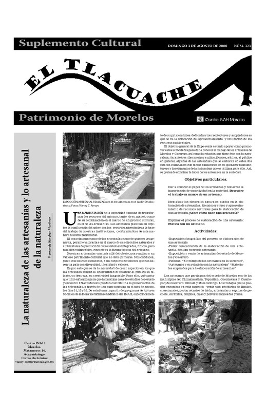 - La naturaleza de las artesanías y lo artesanal de la naturaleza por Fernando Sánchez Martínez. - Primeras exhibiciones cinematográficas en Cuernavaca a 110 años de un testimonio por María Berenice Fregoso. - Remodelación del Centro Histórico de Cuernavaca por Vianey C. Arroyo. - La Zona Arqueológica de Yautepec.