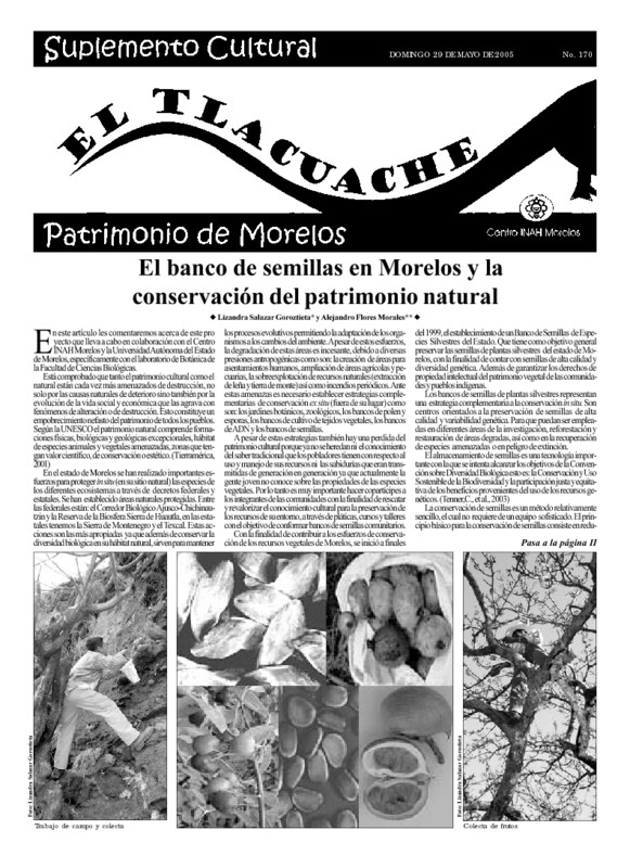 - - El banco de semillas en Morelos y la conservación del patrimonio natural por Lizandra Salazar Goroztieta y Alenajdro Flores Morales.- La colección de orquídeas silvestres del Jardín Etnobotánico por Lizandra Salazar Gorostieta y Feliciano García-Lara. - El Yauhtli por Margarita Avilés y Macrina Fuentes.