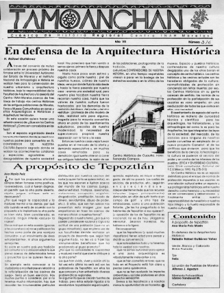 - - En defensa de la Arquitectura Histórica por Heladio Rafael Gutiérrez Yañéz. - A propósito de Tepoztlán por Ana María Pelz. - Verde, Blanco y Colorado por Elvira Pruneda Gallegos. - La Unión de Pueblos de Morelos por Alfonso J. Aguayo. - Memoria fotográfica por Lázaro Sandoval M.