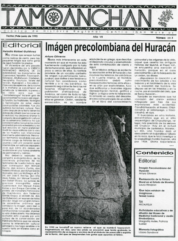 - - Editorial por Heladio Rafael Gutiérrez Yañéz. - Imagen precolombina del huracán por José Arturo Oliveros Morales. - Restauración de la pintura en el Estado de Morelos por Laura Elena Hinojosa Hinojosa. - Que lejos estaba de imaginarse por Teresita Loera Cabeza de Vaca.