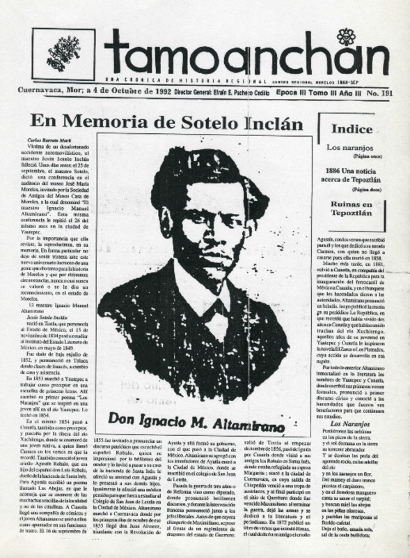 - - En memoria de Sotelo Inclán por Carlos Barreto Mark. - Los naranjos. - 1886 una noticia acerca de Tepoztlán por Heladio Rafael Gutiérrez Yáñez. - En memoria.
