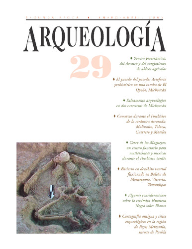 - - Presentación por Ana María Álvarez y Ángel García Cook. - Sonora precerámica: del Arcaico y del surgimiento de aldeas agrícolas por John P. Carpenter, María Guadalupe Sánchez, María Elisa Villalpando. - El pasado del pasado. Artefacto prehistórico en una tumba de El Opeño, Michoacán por Arturo Olivares y Gianfranco Cassiano. - Salvamento arqueológico en dos carreteras de Michoacán. Resultados de las investigaciones por Salvador Pulido Méndez. - Comercio durante el Posclásico de la cerámica decorada: Malinalco, Toluca, Guerrero y Morelos por Michael E. Smith. - Cerro de los Magueyes: un centro funerario para matlatzincas y mexicas durante el Posclásico tardío por María del Carmén Carbajal Correa y Luis Alfonso González Miranda. - Entierro en decúbito ventral flexionado en Balcón de Montezuma, Victoria, Tamaulipas por Victor Hugo Valdovinos Pérez. - Algunas consideraciones sobre la cerámica Huasteca Negro sobre Blanco por Diana Zaragoza Ocaña. - Cartografía antigua y sitios arqueológicos en la región de Reyes Metzontla, sureste de Puebla por Francisco Rivas Castro. - Avance del estudio contextual de los sistemas de canales prehispánicos “fosilizados” del Valle de Tehuacán, Puebla por James A. Neely y Blas Castellón Huerta. - Cuatro vasos policromos de Lagartero, Chiapas por Sonia Rivero Torres. - La cueva de Las Serpientes. Una representación prehispánica de la bóveda celeste por Sara Ladrón de Guevara. - Análisis del isótopo de oxígeno del Entierro 2.A, Pirámide de la Luna, Teotihuacan por Christine D. White, Michael W. Spence, Fred J. Longstaffe y Kim R. Law. - Informes de Archivo Técnico. Con el arqueólogo Héctor Gálvez. Un rescate en Chimalhuacán por Ana María Crespo. - Informe de la primera temporada de trabajo realizada en Chimalhuacán, Estado de México, del 29 de junio al 12 de septiembre de 1964. Arqueólogo Héctor V. Gálvez por Ana María Crespo. - Informe preliminar de los trabajos realizados en el área arqueológica de Culiacán, Sinaloa, sitio del ejido de Los Mezcales. Arqueólogo Héctor V. Gálvez, 1968 por Ana María Crespo. - Reseña. Crónica de los reyes y reinas mayas por Emiliano Melgar Tísoc. - Proyecto de investigación sobre El urbanismo en Mesoamérica por Alba Guadalupe Mastache.